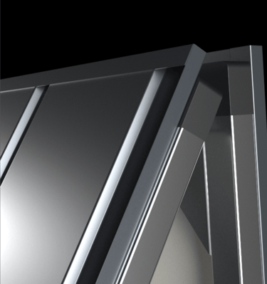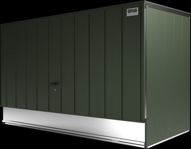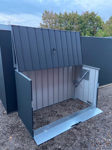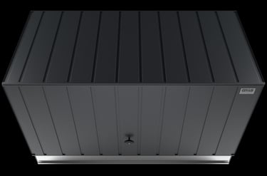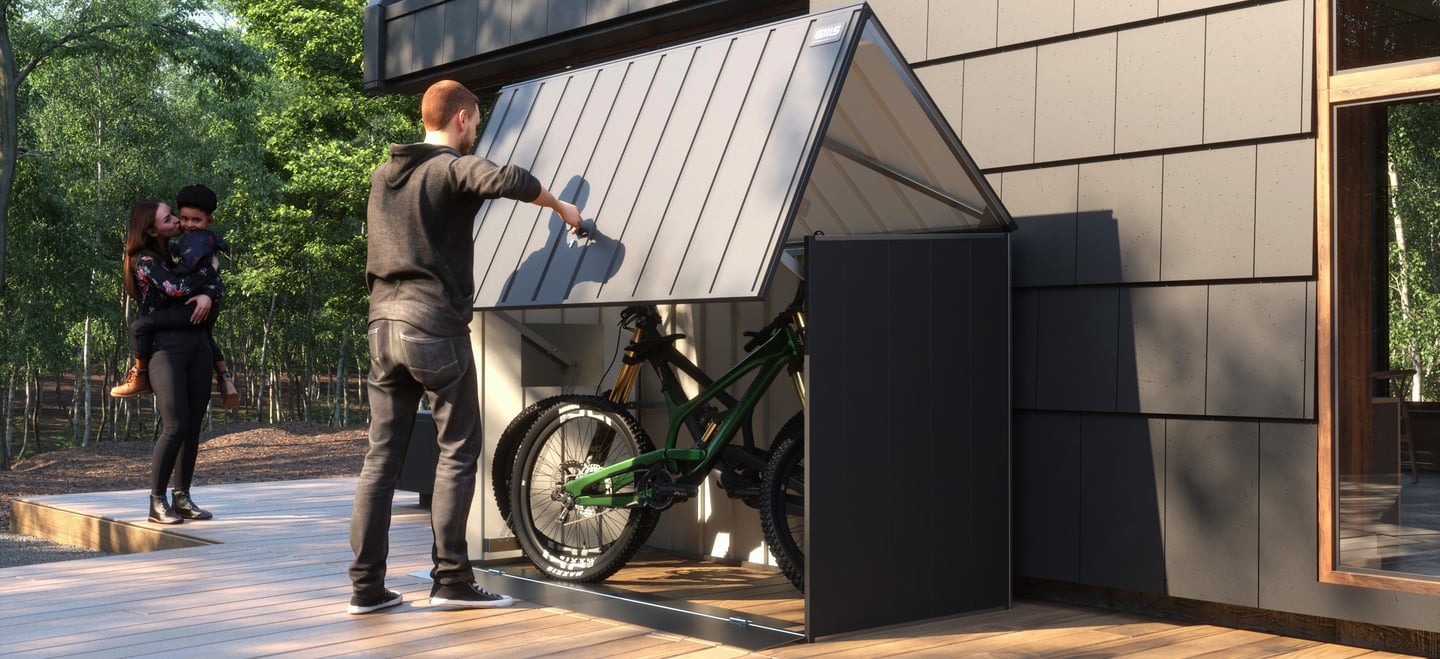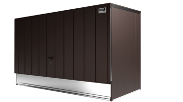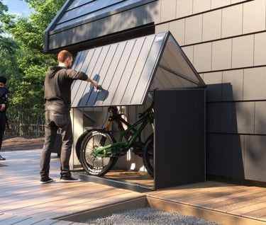 Apatinė saugyklos dalis sukurta su funkcionalumu ir patogumu. Plieninė slenkstis su elegantiška rankena bei neodimio magnetais užtikrina tvirtą uždarymą, o specialūs lankstai ir profiliuota rampa palengvina dviračio įvežimą. Ši apgalvota konstrukcija sujungia tvirtumą ir patogumą. Svarbiausią stabilumo elementą sudaro patentuoti trikampiai su C profiliais, užtikrinantys dangčio tvirtumą. Reguliuojami trikampiai leidžia tiksliai sureguliuoti sienas, o CNC pjauti plieniniai kampai dar labiau stiprina struktūrą, suteikdami ilgaamžiškumo.